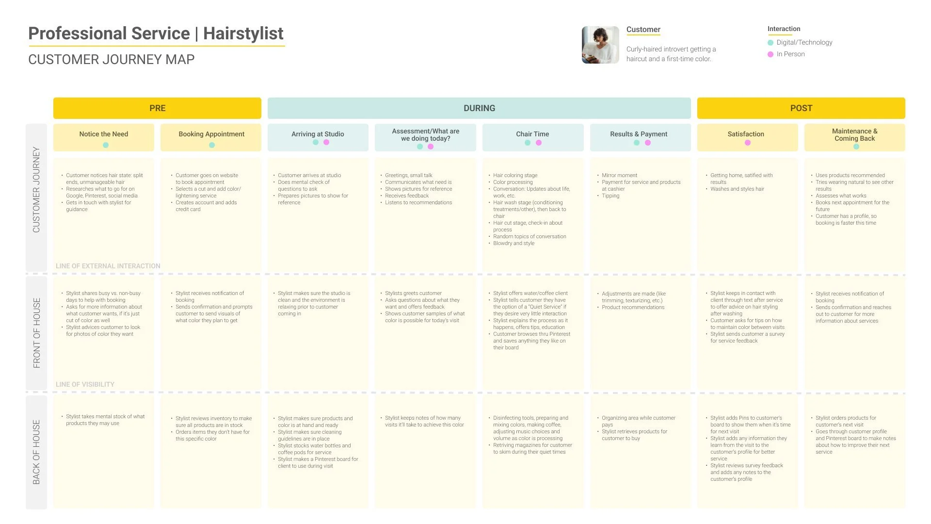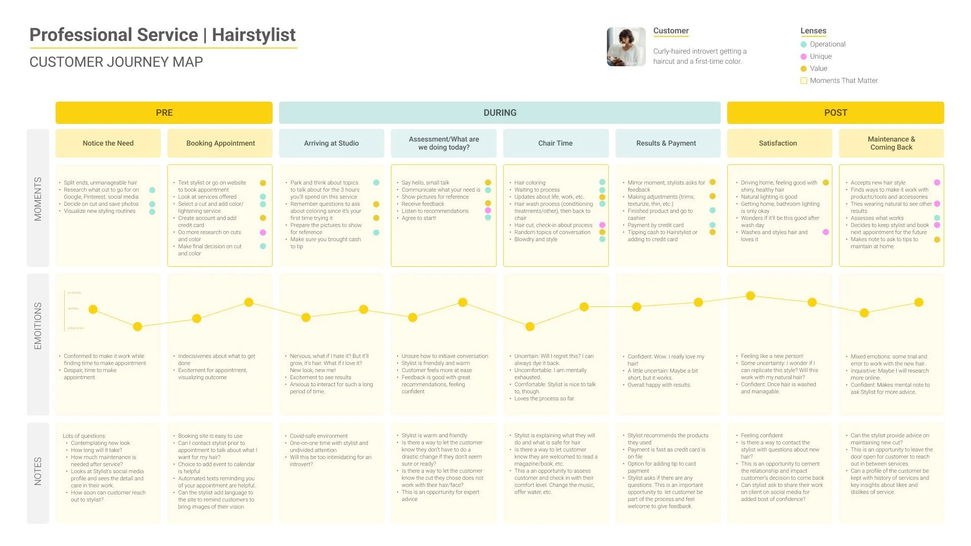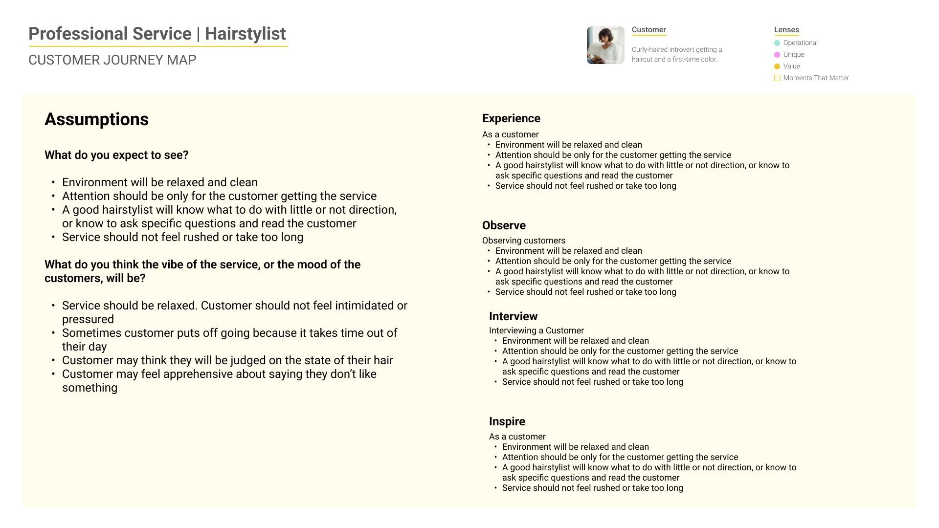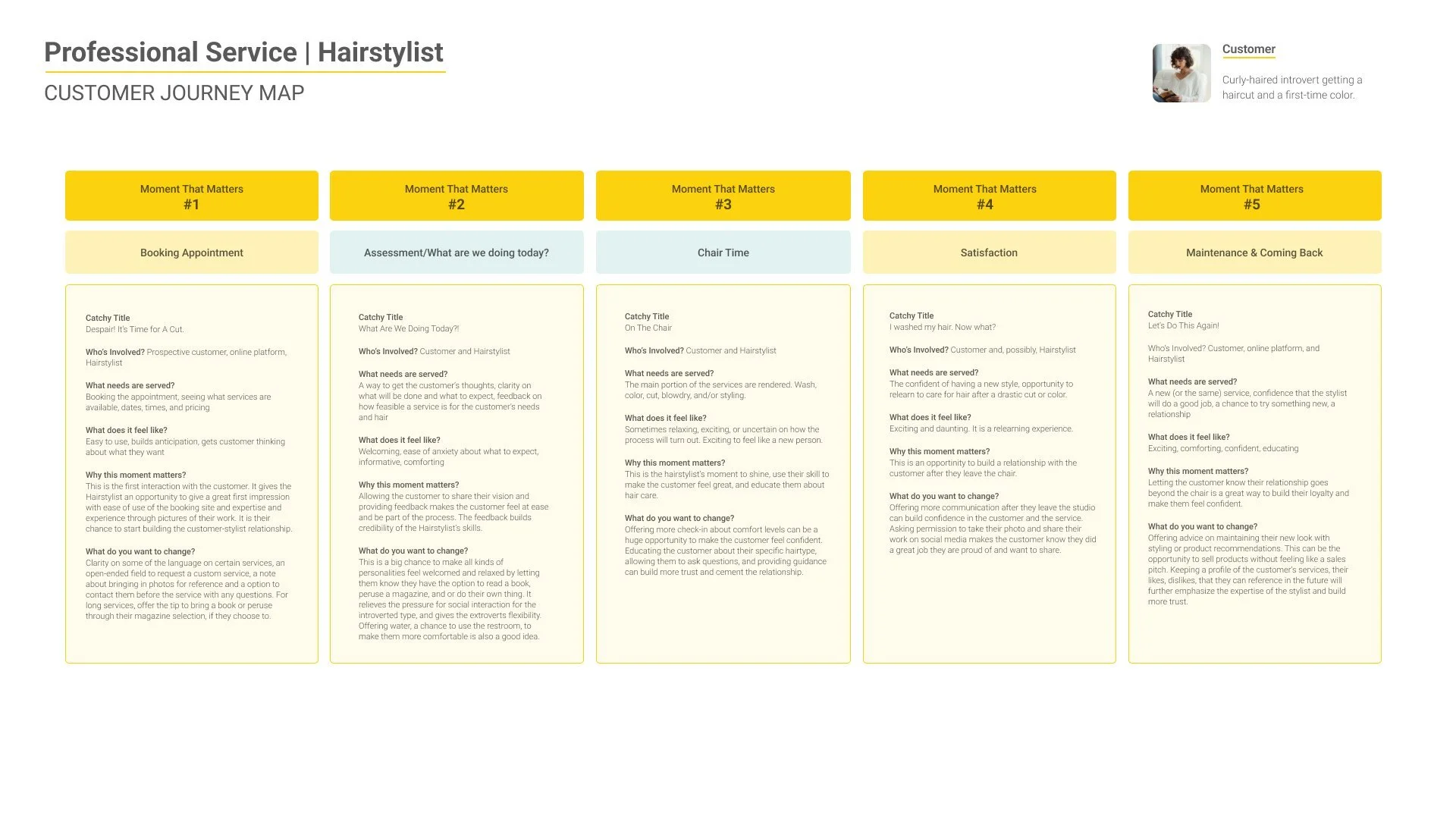 The customer persona is a professional, introvert, low-maintenance, but willing to try new things. They value comfort, authenticity, transparency, empathy, and education about how to maintain the work the stylist has put into their hair in-between visits.